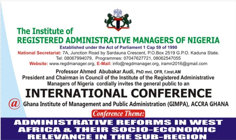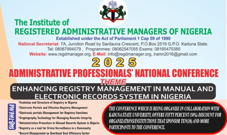 Institute of Registered Administrative Managers of Nigeria also known as Council of Registered Administrative Managers of Nigeria, is established under the Act 1 Cap 59 of 1990 as limited by Guarantee Company. The Institute establishment is bore out of interest of her promoters to advance the practice of Administrative Management (a staff function of management which emphases organization, system, procedures, and methods). Promoters and management of the Institute are aware that “Knowledge custodians should be socially responsible in knowledge use; hence, a call to professionalism is a call to an obligation on when and how knowledge is applied. Otherwise, the evils of free market societies will be echoed at the expense of good tidings of capitalism”. As such, as an Institute, it creates platform that seeks to promote her members’ intellectual and professional insight. This is to apart from updating members knowledge and skills on trending competence, also constantly, put in their consciousness that their success shall be valued if their professional prowess imparted positively on their physical and social environments, while at same time balancing other stakeholders’ interest.
